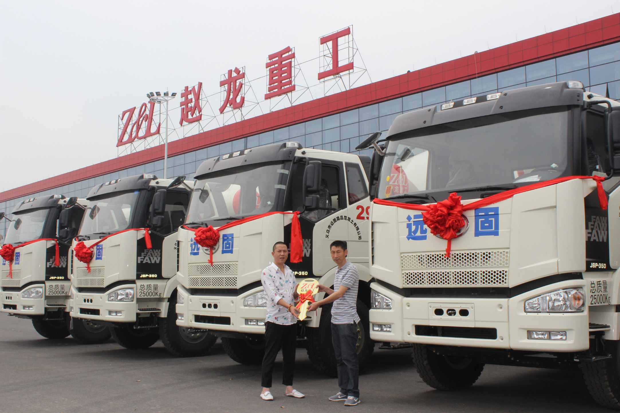 5月9日上午,浙江趙龍重工有限公司于廠區(qū)舉辦了交車儀式。又一批10臺(tái)攪拌車成功交付義烏遠(yuǎn)固商品混凝土有限公司。圖為趙龍重工區(qū)域經(jīng)理夏慶華(右)將“金鑰匙”交付遠(yuǎn)固公司車隊(duì)長(zhǎng)方春紅(左)。